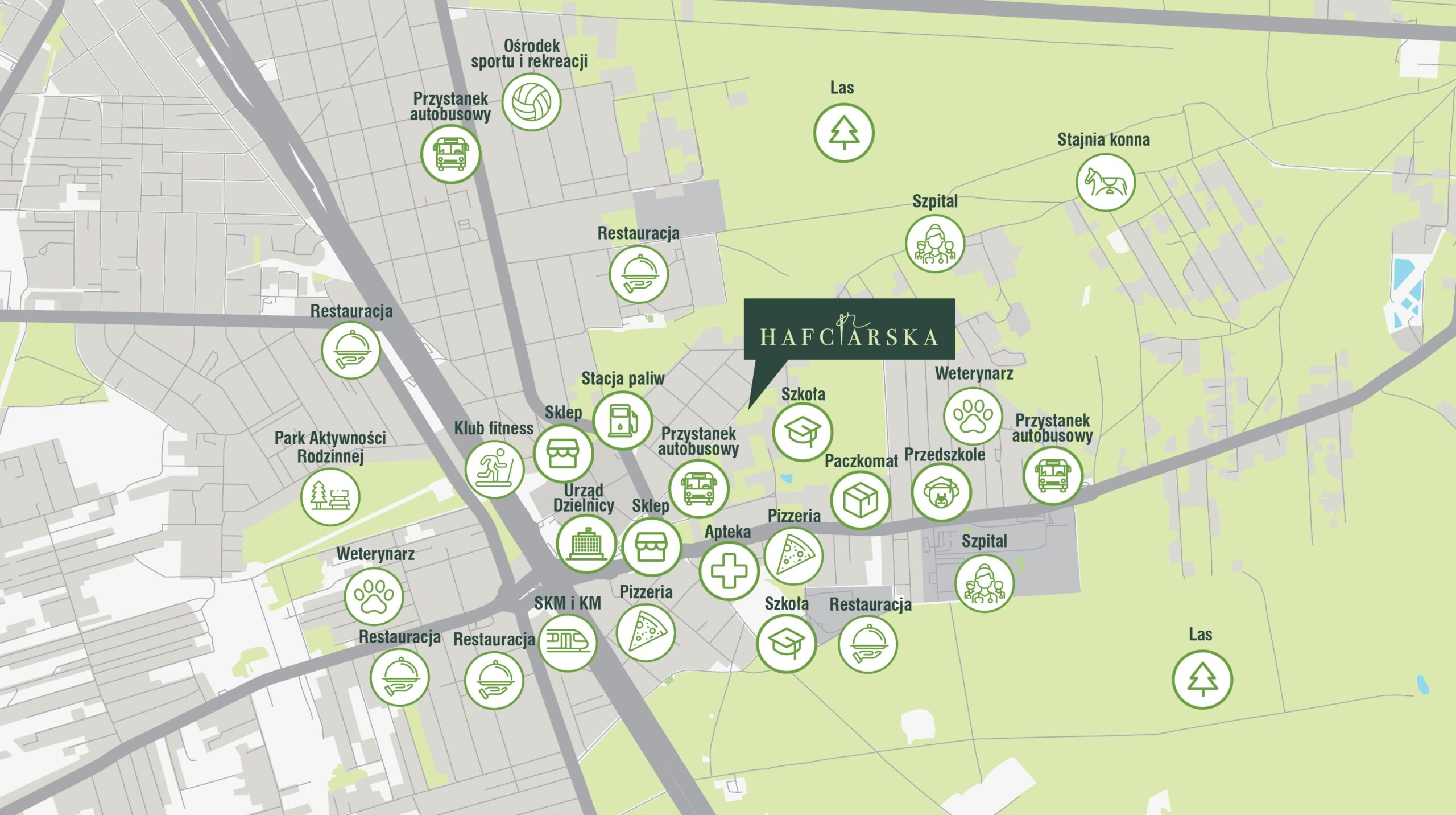 Hafciarska to osiedle, które łączy bliskość natury, kameralny charakter oraz wysoki standard życia. Otoczone zielenią, zapewnia spokój i prywatność, z dala od miejskiego zgiełku.